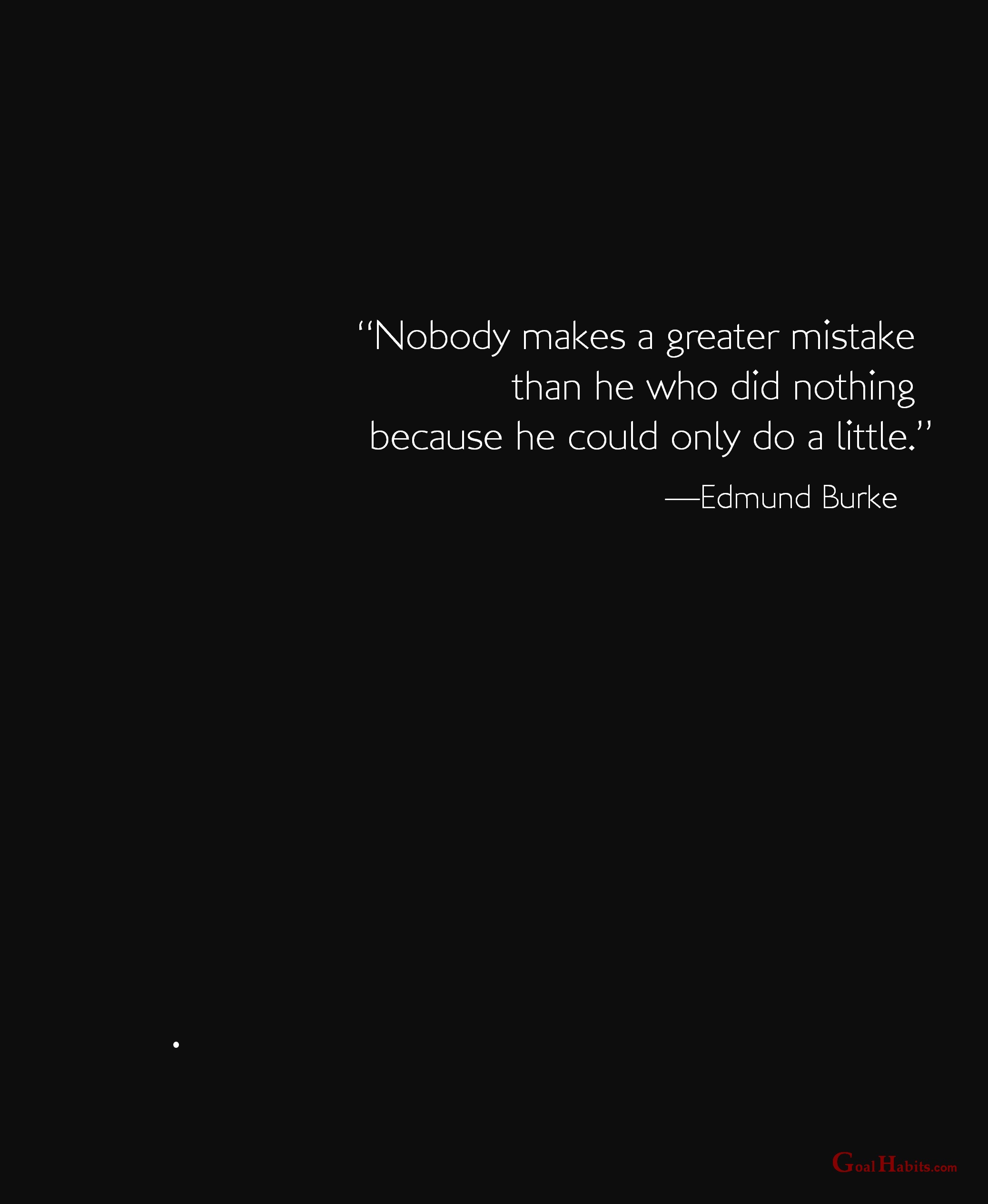 Success Quote – June 11, 2017 Posted on June 11, 2017 by Paul Mark Sutherland “Nobody makes a greater mistake than he who did nothing because he could only do a little.” —Edmund Burke __________________________ Enjoy today. Achieve today. Tomorrow is promised to no one! original graphic credit: unknown Share this: Click to share on Facebook (Opens in new window) Facebook Click to share on X (Opens in new window) X Click to share on LinkedIn (Opens in new window) LinkedIn Click to share on Pinterest (Opens in new window) Pinterest Click to share on Reddit (Opens in new window) Reddit Click to email a link to a friend (Opens in new window) Email More Click to print (Opens in new window) Print Like Loading...