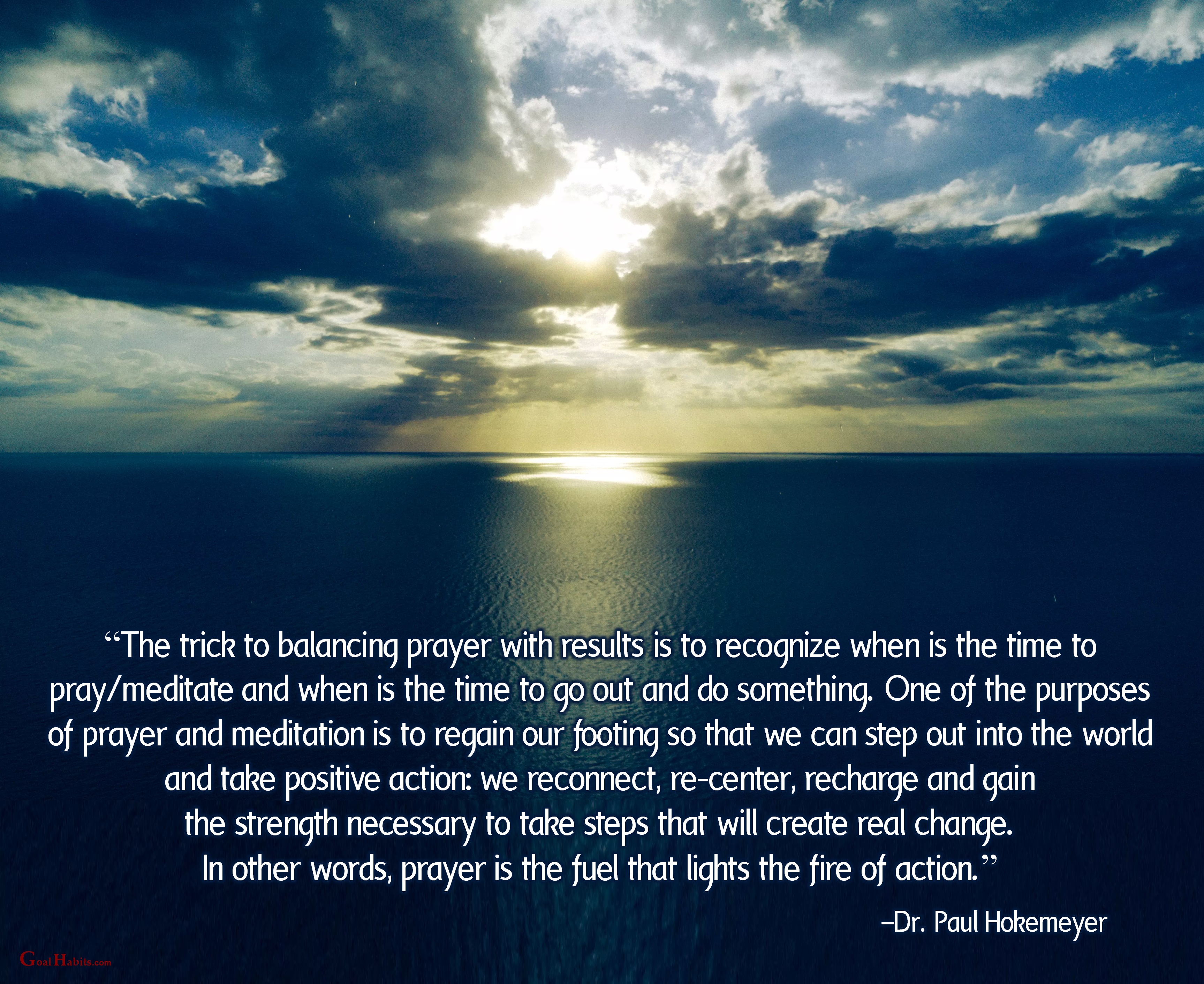 “The trick to balancing prayer with results is to recognize when is the time to pray/meditate and when is the time to go out and do something. One of the purposes of prayer and meditation is to regain our footing so that we can step out into the world and take positive action: we reconnect, re-center, recharge and gain the strength necessary to take steps that will create real change. In other words, prayer is the fuel that lights the fire of action.”