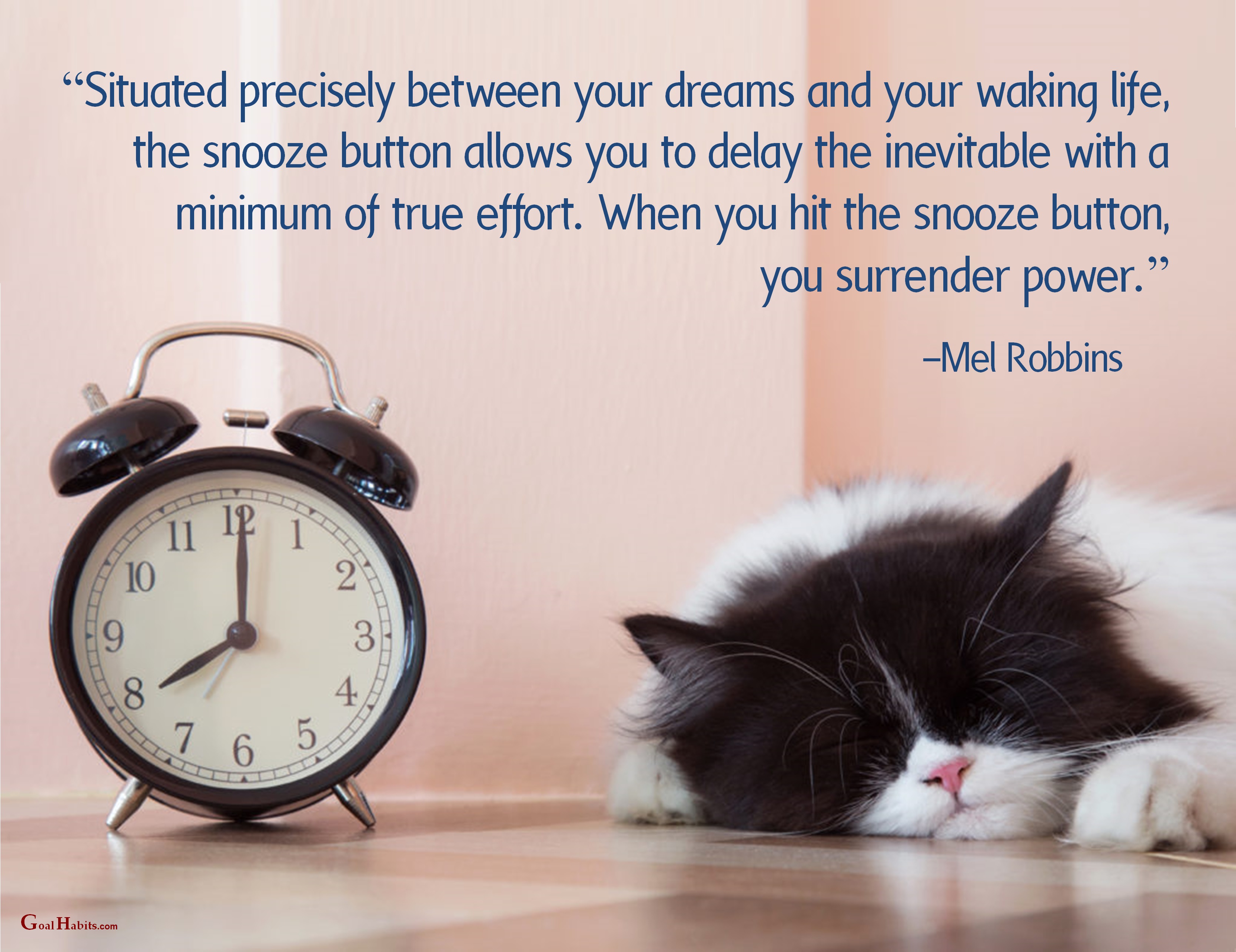 “Situated precisely between your dreams and your waking life, the snooze button allows you to delay the inevitable with a minimum of true effort. When you hit the snooze button, you surrender power.”