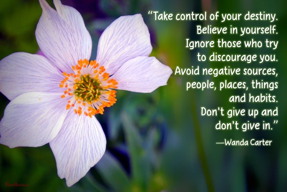 “Take control of your destiny. Believe in yourself. Ignore those who try to discourage you. Avoid negative sources, people, places, things and habits. Don’t give up and don’t give in.”