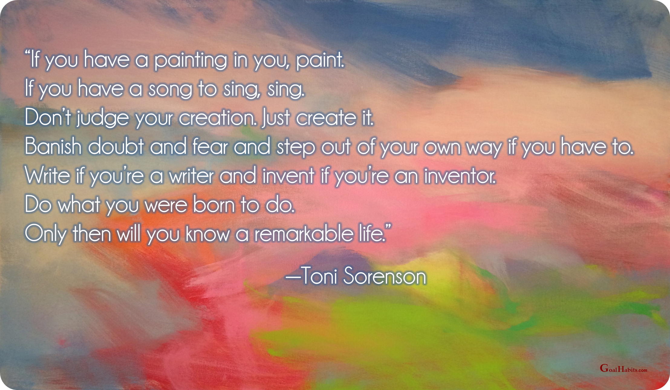 “If you have a painting in you, paint. If you have a song to sing, sing. Don’t judge your creation. Just create it. Banish doubt and fear and step out of your own way if you have to. Write if you’re a writer and invent if you’re an inventor. Do what you were born to do. Only then will you know a remarkable life.”