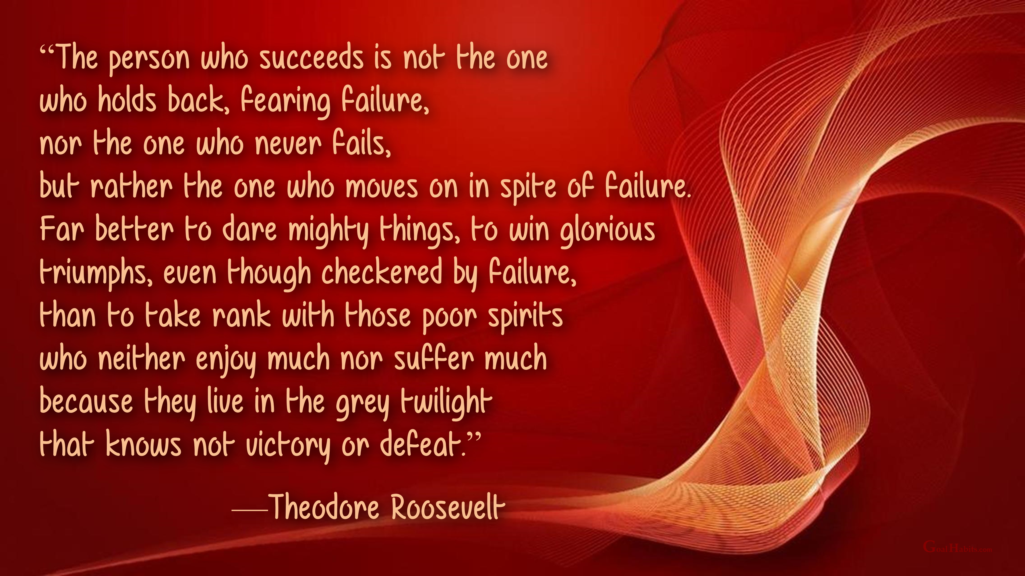 “The person who succeeds is not the one who holds back, fearing failure, nor the one who never fails, but rather the one who moves on in spite of failure. Far better to dare mighty things, to win glorious triumphs, even though checkered by failure, than to take rank with those poor spirits who neither enjoy much nor suffer much because they live in the grey twilight that knows not victory or defeat.”