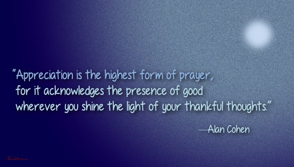 “Appreciation is the highest form of prayer, for it acknowledges the presence of good wherever you shine the light of your thankful thoughts.”