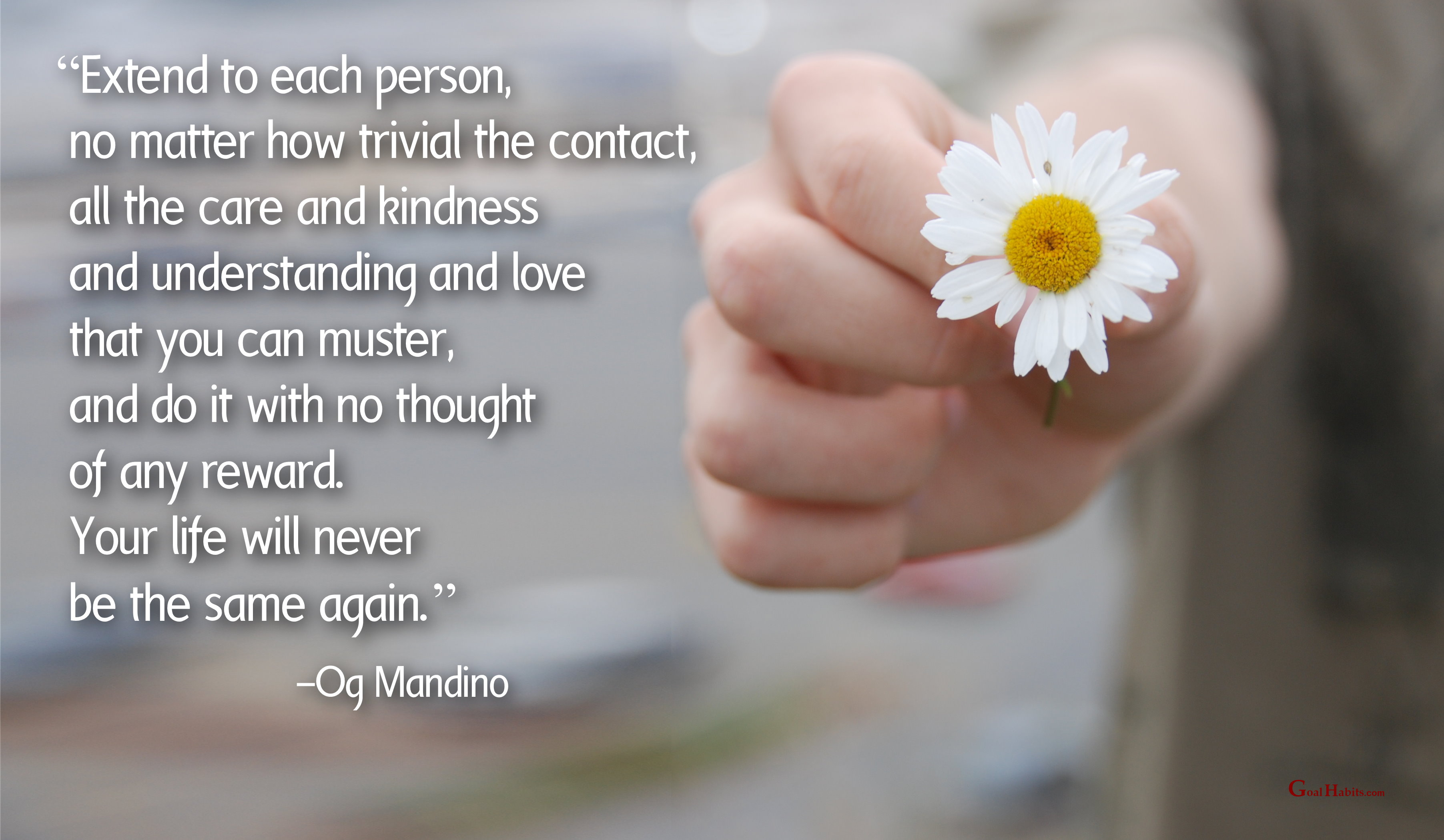 “Extend to each person, no matter how trivial the contact, all the care and kindness and understanding and love that you can muster, and do it with no thought of any reward. Your life will never be the same again.”