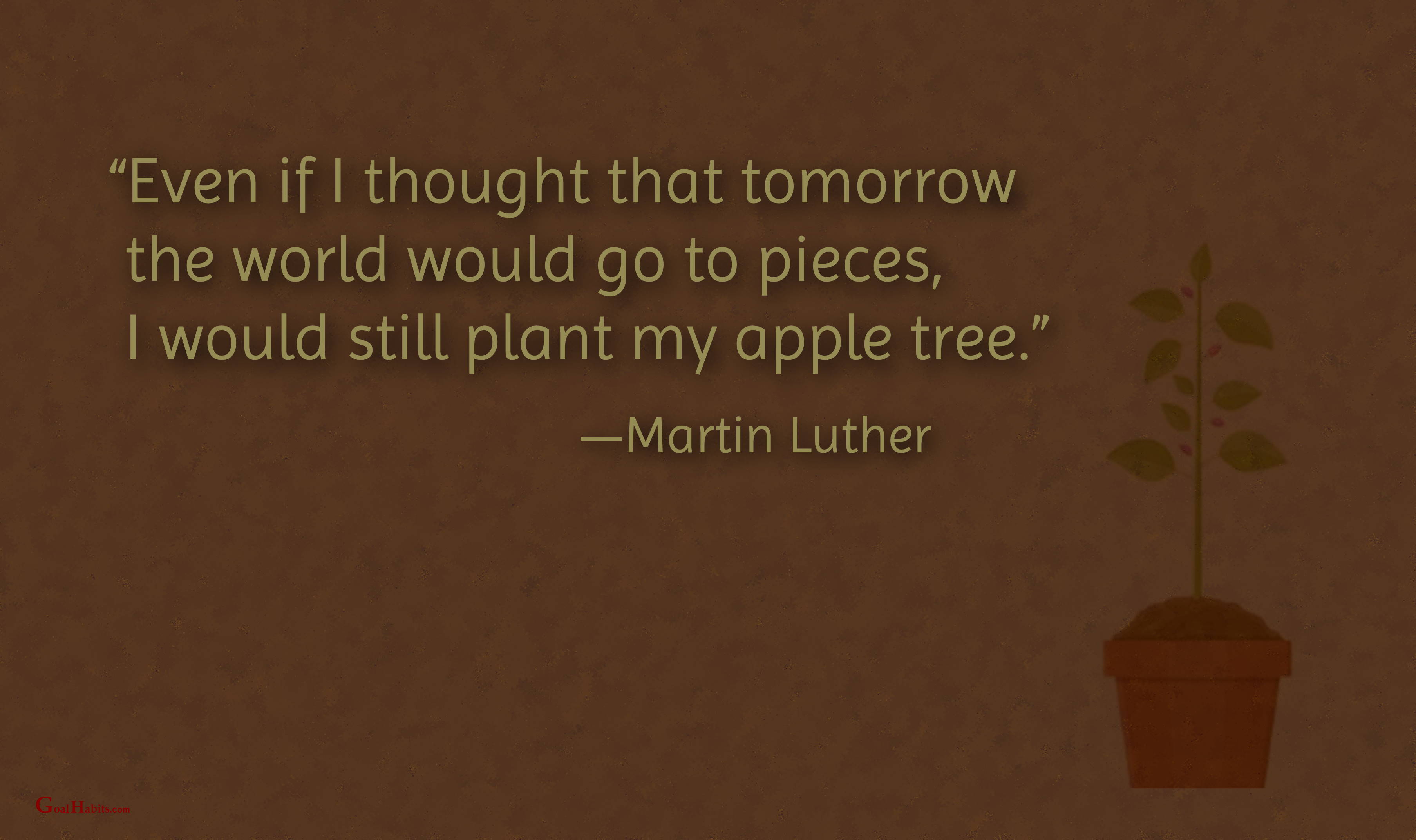 Success Quote on Optimism Posted on January 16, 2020 by Paul Mark Sutherland “Even if I thought that tomorrow the world would go to pieces, I would still plant my apple tree.” —Martin Luther ________________________ Enjoy today. Achieve today. Tomorrow is promised to no one! original graphic credit: unknown Share this: Click to share on Facebook (Opens in new window) Facebook Click to share on X (Opens in new window) X Click to share on LinkedIn (Opens in new window) LinkedIn Click to share on Pinterest (Opens in new window) Pinterest Click to share on Reddit (Opens in new window) Reddit Click to email a link to a friend (Opens in new window) Email More Click to print (Opens in new window) Print Like Loading...