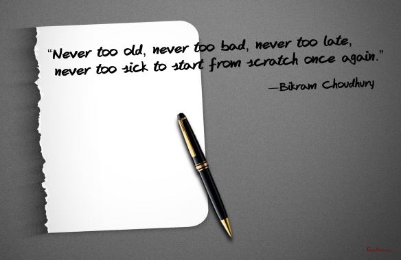 Success Quote on Starting Over Posted on December 30, 2020 by Paul Mark Sutherland “Never too old, never too bad, never too late, never too sick to start from scratch once again.” —Bikram Choudhury ________________________ Enjoy today. Achieve today. Tomorrow is promised to no one! original graphic credits: unknown Share this: Click to share on Facebook (Opens in new window) Facebook Click to share on X (Opens in new window) X Click to share on LinkedIn (Opens in new window) LinkedIn Click to share on Pinterest (Opens in new window) Pinterest Click to share on Reddit (Opens in new window) Reddit Click to email a link to a friend (Opens in new window) Email More Click to print (Opens in new window) Print Like Loading...