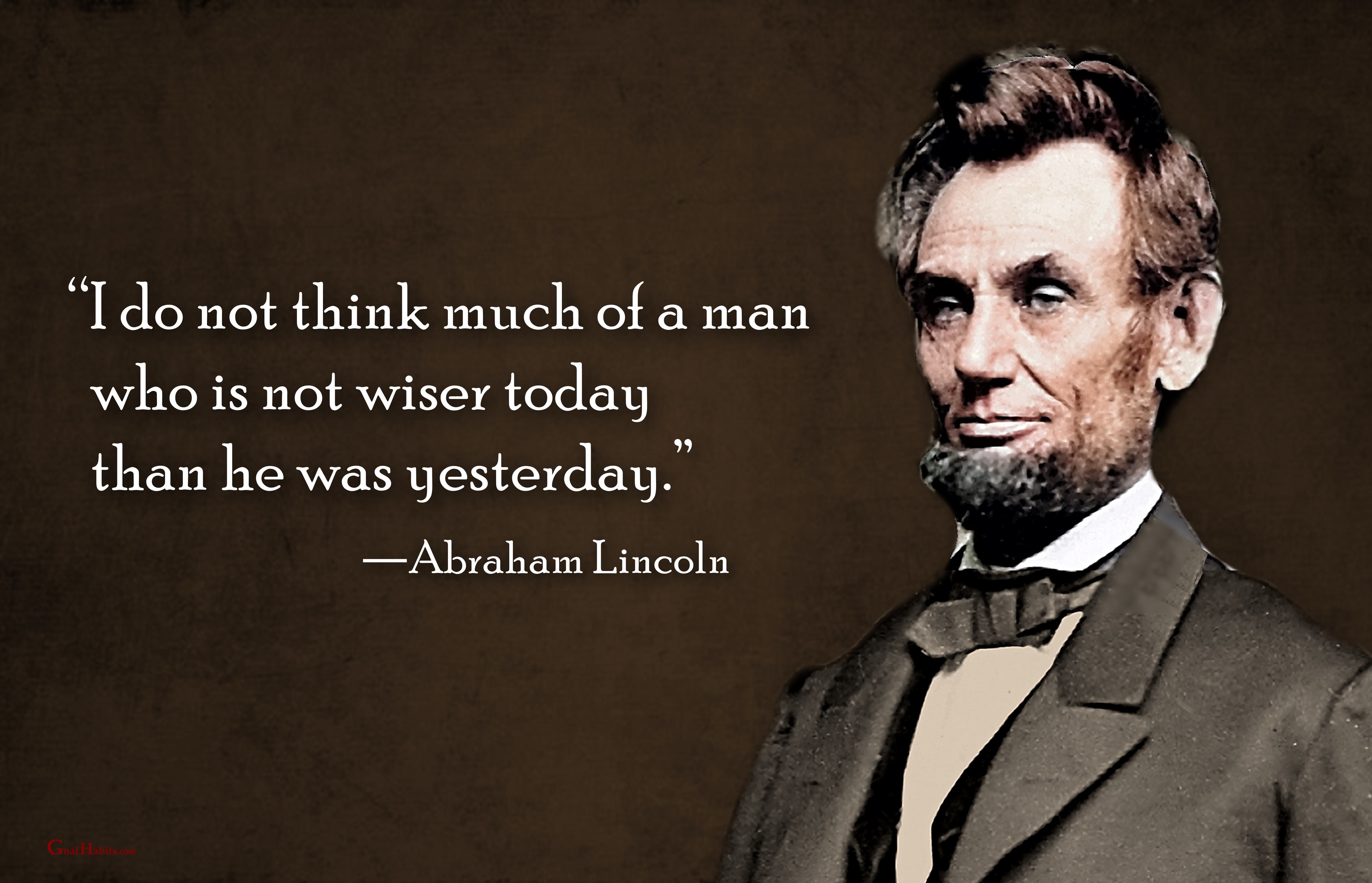 Success Quote on Personal Development Posted on October 6, 2021 by Paul Mark Sutherland “I do not think much of a man who is not wiser today than he was yesterday.” –Abraham Lincoln ________________________ Enjoy today. Achieve today. Tomorrow is promised to no one! original graphic credit: unknown Share this: Click to share on Facebook (Opens in new window) Facebook Click to share on X (Opens in new window) X Click to share on LinkedIn (Opens in new window) LinkedIn Click to share on Pinterest (Opens in new window) Pinterest Click to share on Reddit (Opens in new window) Reddit Click to email a link to a friend (Opens in new window) Email More Click to print (Opens in new window) Print Like Loading...