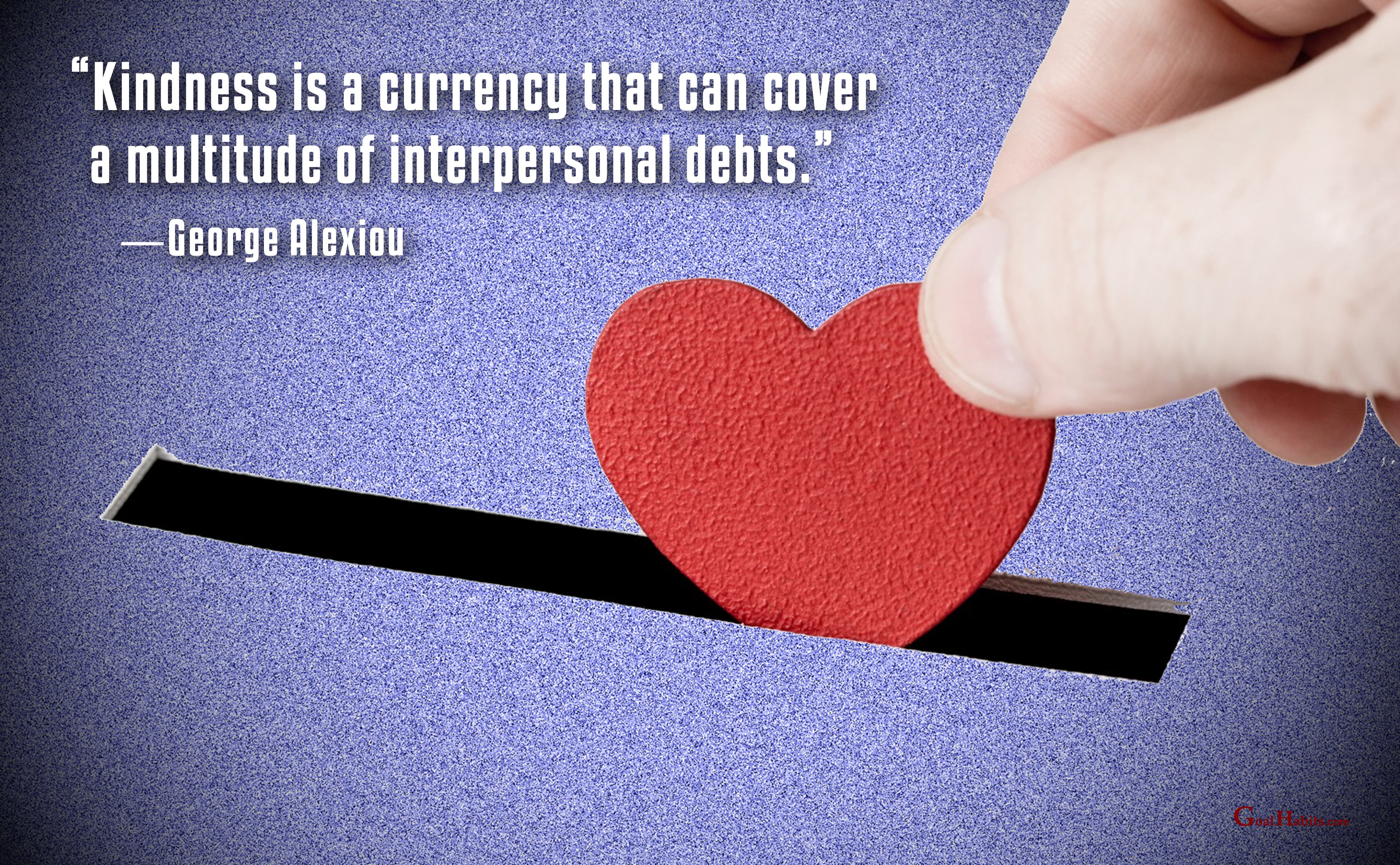 Success Quote on Kindness Posted on May 23, 2022 by Paul Mark Sutherland “Kindness is a currency that can cover a multitude of interpersonal debts.” ―George Alexiou ________________________ Enjoy today. Achieve today. Tomorrow is promised to no one! original graphic credit: unknown Share this: Click to share on Facebook (Opens in new window) Facebook Click to share on X (Opens in new window) X Click to share on LinkedIn (Opens in new window) LinkedIn Click to share on Pinterest (Opens in new window) Pinterest Click to share on Reddit (Opens in new window) Reddit Click to email a link to a friend (Opens in new window) Email More Click to print (Opens in new window) Print Like Loading...