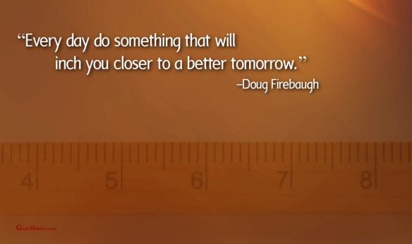 Success Quote on Happiness Posted on May 22, 2024 by Paul Mark Sutherland “Every day do something that will inch you closer to a better tomorrow.”—Doug Firebaugh ________________________ Enjoy today.Achieve today.Tomorrow is promised to no one! original graphic credit: unknown Share this: Click to share on Facebook (Opens in new window) Facebook Click to share on X (Opens in new window) X Click to share on LinkedIn (Opens in new window) LinkedIn Click to share on Pinterest (Opens in new window) Pinterest Click to share on Reddit (Opens in new window) Reddit Click to email a link to a friend (Opens in new window) Email More Click to print (Opens in new window) Print Like Loading...