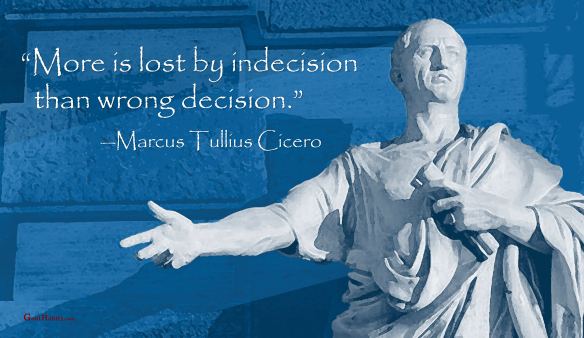 Success Quote on Decisiveness Posted on May 4, 2023 by Paul Mark Sutherland Reply “More is lost by indecision than wrong decision.” —Marcus Tullius Cicero ________________________ Enjoy today. Achieve today. Tomorrow is promised to no one! original graphic credit: unknown Share this: Share on Facebook (Opens in new window) Facebook Share on X (Opens in new window) X Share on LinkedIn (Opens in new window) LinkedIn Share on Pinterest (Opens in new window) Pinterest Share on Reddit (Opens in new window) Reddit Email a link to a friend (Opens in new window) Email More Print (Opens in new window) Print Like Loading...