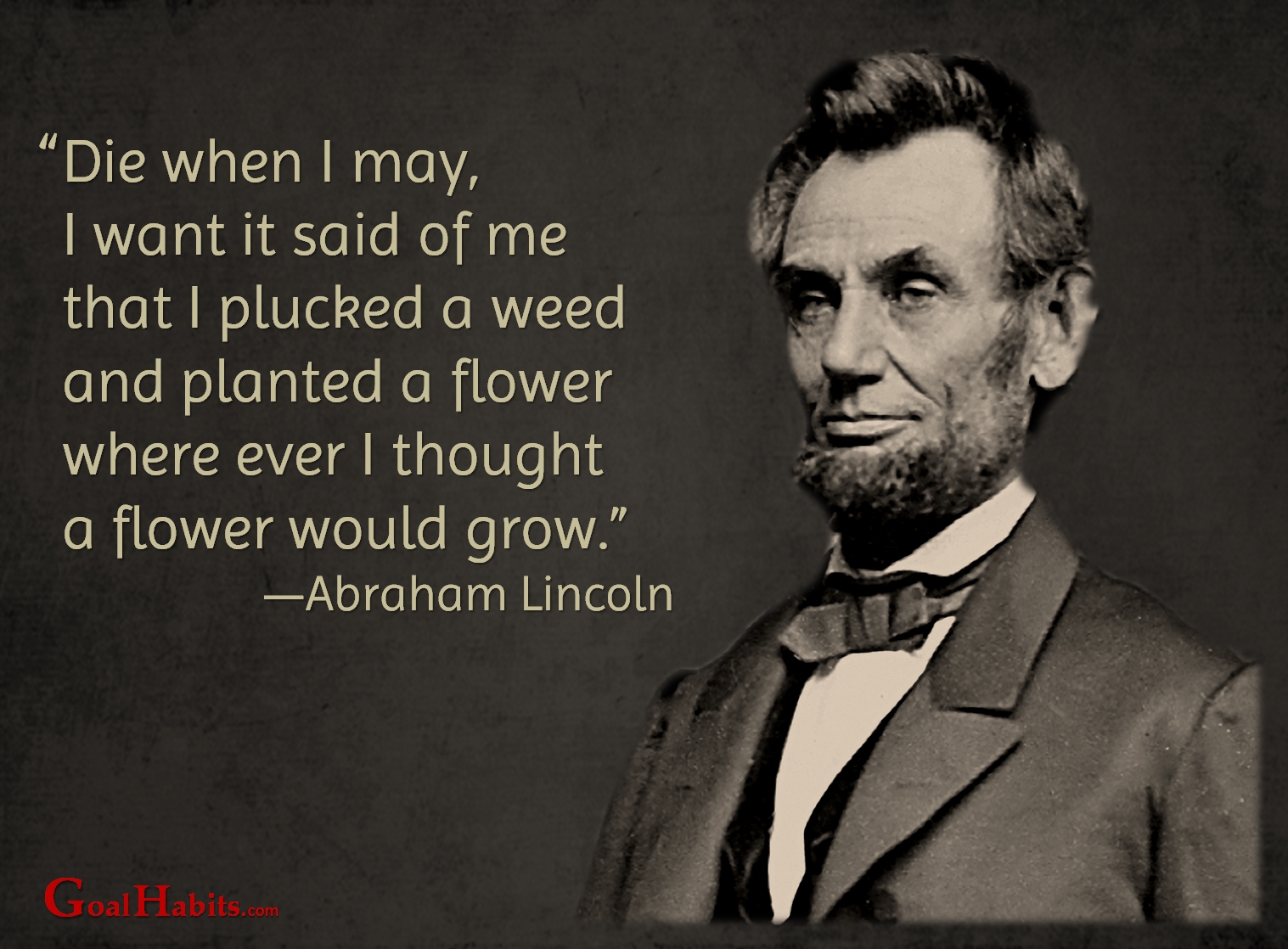 Success Quote – Oct. 23, 2016 Posted on October 23, 2016 by Paul Mark Sutherland Reply “Die when I may, I want it said of me that I plucked a weed and planted a flower where ever I thought a flower would grow.” —Abraham Lincoln ___________________________________ Enjoy today. Achieve today. Tomorrow is promised to no one! original graphic credit: unknown Share this: Click to share on Facebook (Opens in new window) Facebook Click to share on X (Opens in new window) X Click to share on LinkedIn (Opens in new window) LinkedIn Click to share on Pinterest (Opens in new window) Pinterest Click to share on Reddit (Opens in new window) Reddit Click to email a link to a friend (Opens in new window) Email More Click to print (Opens in new window) Print Like Loading...