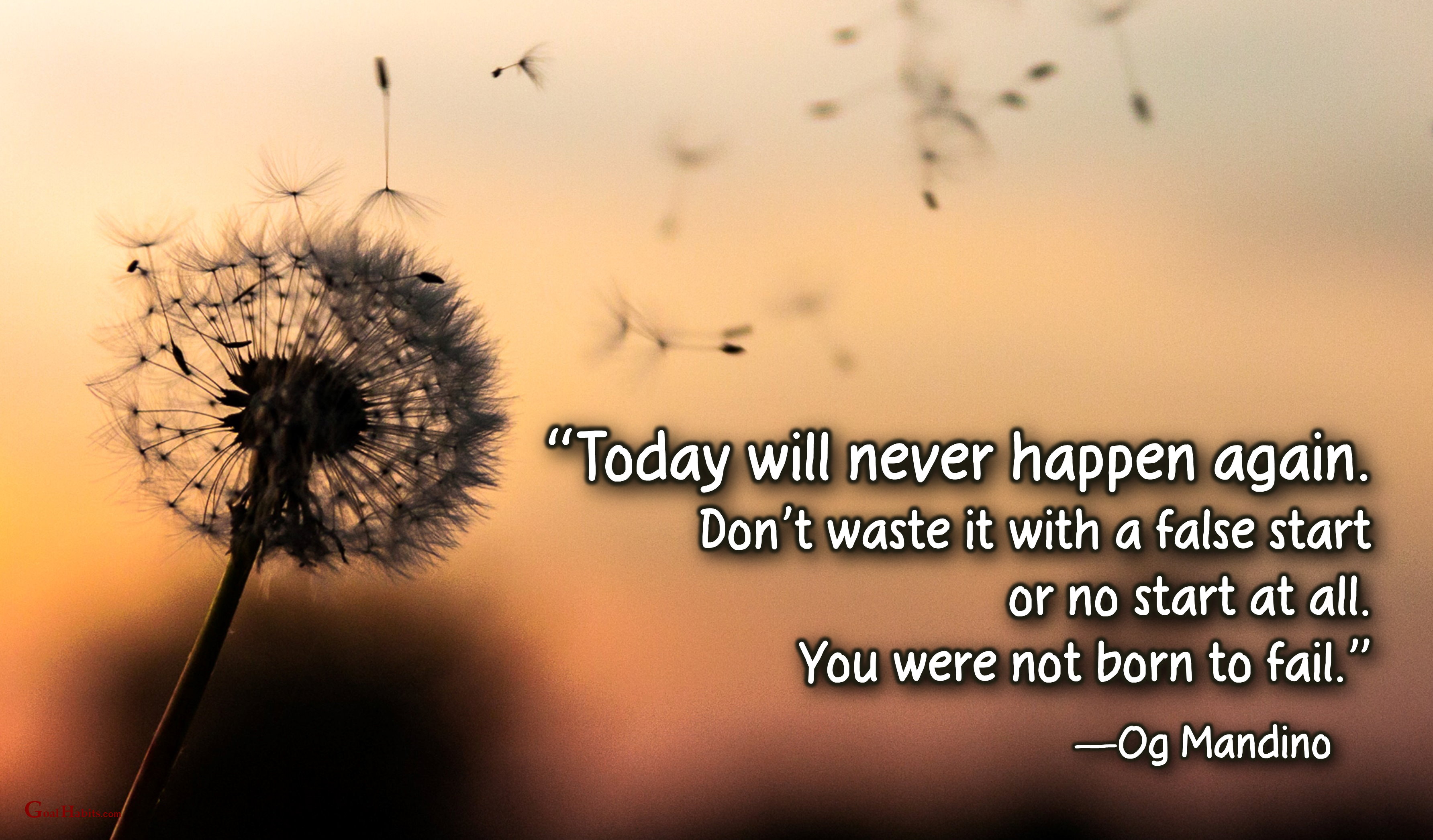 Success Quote on Passion Posted on October 28, 2019 by Paul Mark Sutherland Reply “Today will never happen again. Don’t waste it with a false start or no start at all. You were not born to fail.” —Og Mandino ________________________ Enjoy today. Achieve today. Tomorrow is promised to no one! original graphic credit: unknown Share this: Share on Facebook (Opens in new window) Facebook Share on X (Opens in new window) X Share on LinkedIn (Opens in new window) LinkedIn Share on Pinterest (Opens in new window) Pinterest Share on Reddit (Opens in new window) Reddit Email a link to a friend (Opens in new window) Email More Print (Opens in new window) Print Like Loading...