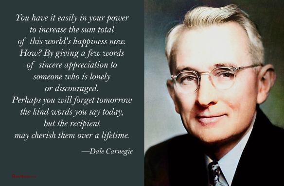 “You have it easily in your power to increase the sum total of this world’s happiness now. How? By giving a few words of sincere appreciation to someone who is lonely or discouraged. Perhaps you will forget tomorrow the kind words you say today, but the recipient may cherish them over a lifetime.” —Dale Carnegie