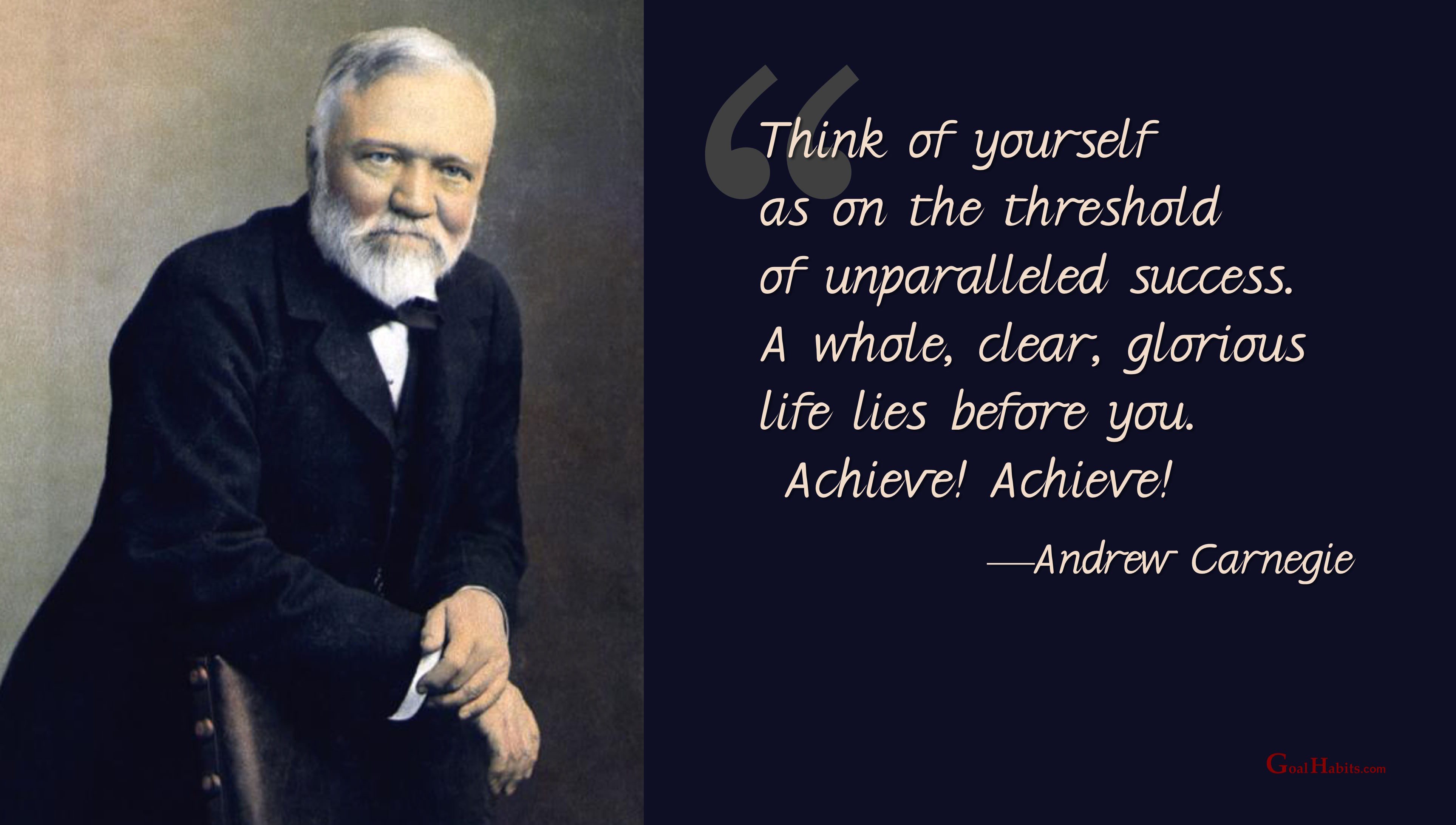 Success Quote on Success Posted on January 30, 2023 by Paul Mark Sutherland Reply “Think of yourself as on the threshold of unparalleled success. A whole, clear, glorious life lies before you. Achieve! Achieve! ” —Andrew Carnegie ________________________ Enjoy today. Achieve today. Tomorrow is promised to no one! original graphic credit: unknown Share this: Click to share on Facebook (Opens in new window) Facebook Click to share on X (Opens in new window) X Click to share on LinkedIn (Opens in new window) LinkedIn Click to share on Pinterest (Opens in new window) Pinterest Click to share on Reddit (Opens in new window) Reddit Click to email a link to a friend (Opens in new window) Email More Click to print (Opens in new window) Print Like Loading...