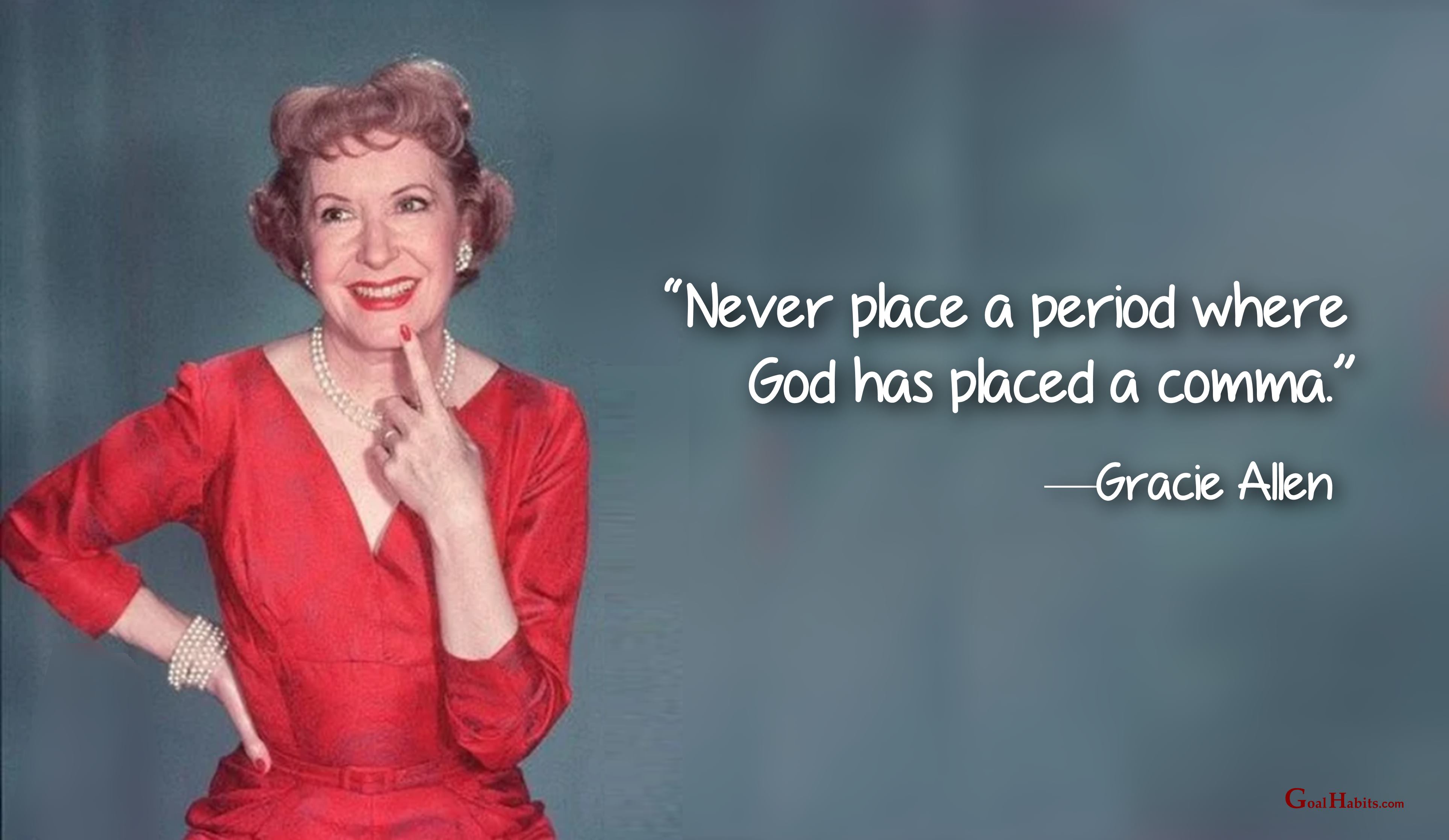 Success Quote on Persistence Posted on April 29, 2022 by Paul Mark Sutherland Reply “Never place a period where God has placed a comma.” —Gracie Allen ________________________ Enjoy today. Achieve today. Tomorrow is promised to no one! original graphic credit: unknown Share this: Click to share on Facebook (Opens in new window) Facebook Click to share on X (Opens in new window) X Click to share on LinkedIn (Opens in new window) LinkedIn Click to share on Pinterest (Opens in new window) Pinterest Click to share on Reddit (Opens in new window) Reddit Click to email a link to a friend (Opens in new window) Email More Click to print (Opens in new window) Print Like Loading...