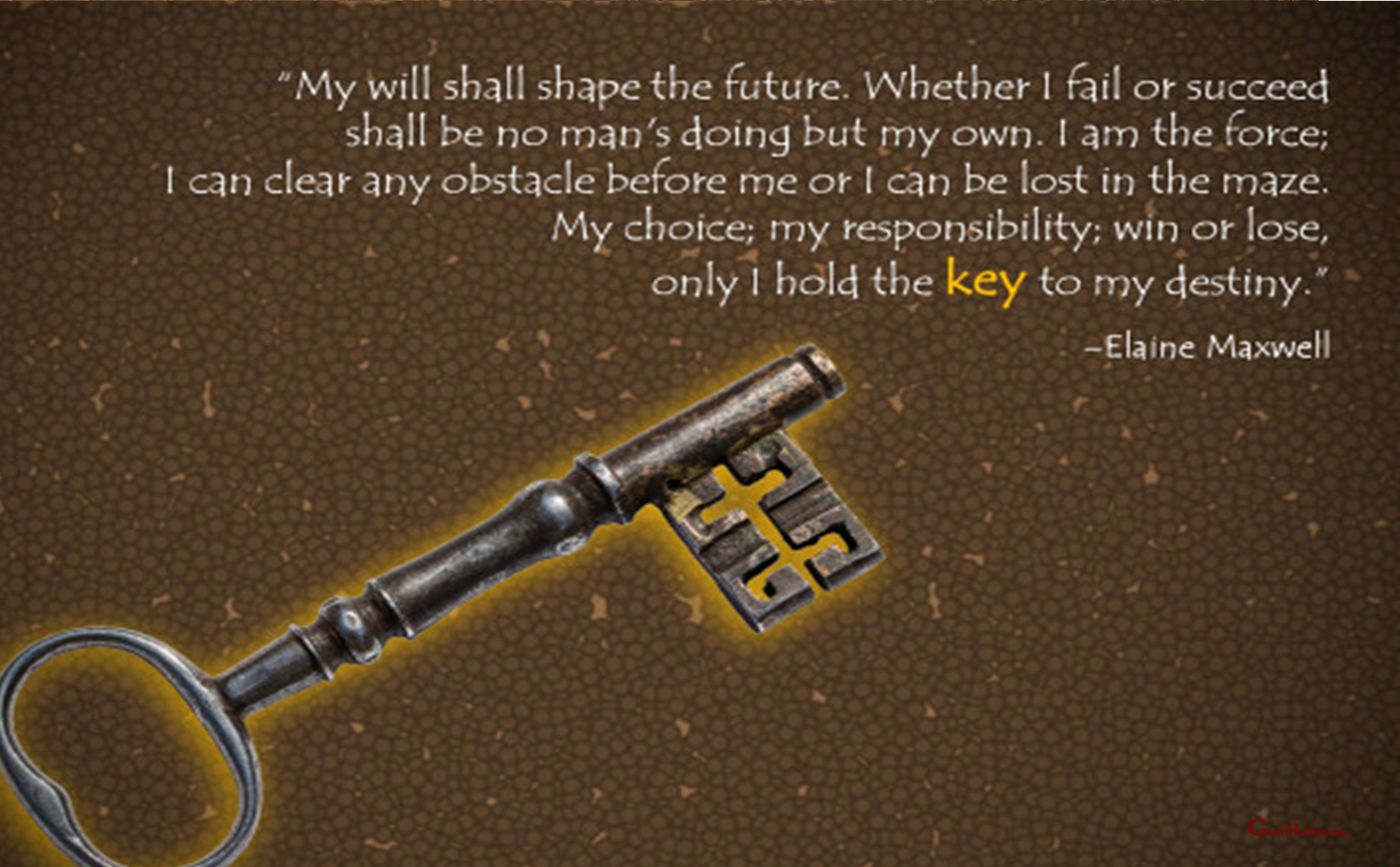 “My will shall shape the future. Whether I fail or succeed shall be no man’s doing but my own. I am the force; I can clear any obstacle before me or I can be lost in the maze. My choice; my responsibility; win or lose, only I hold the key to my destiny.”