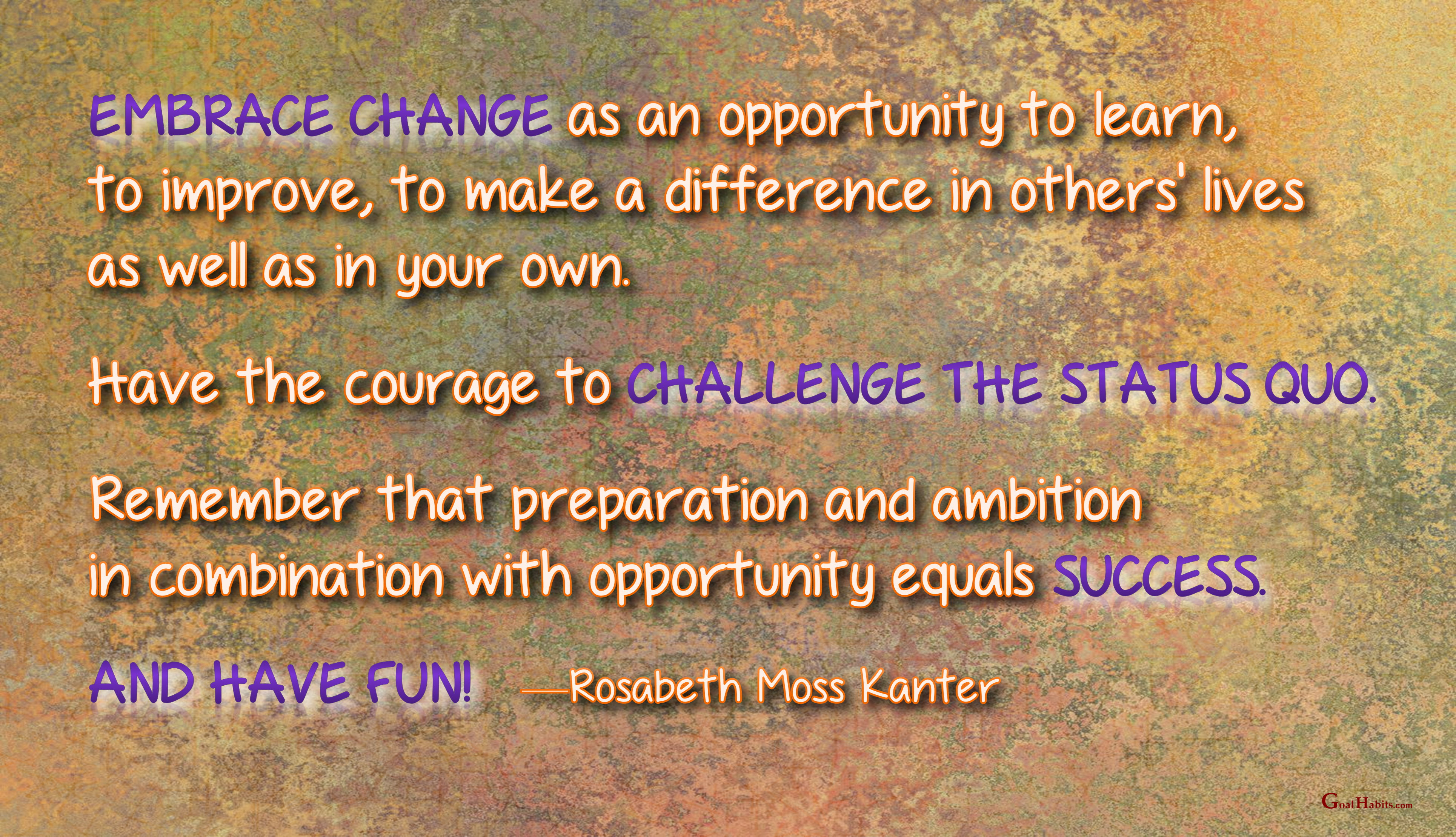 “Embrace change as an opportunity to learn, to improve, to make a difference in others’ lives as well as in your own. Have the courage to challenge the status quo. Remember that preparation and ambition in combination with opportunity equals success. And have fun!”