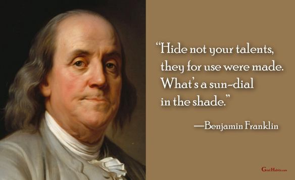 Success Quote on Potential Posted on September 29, 2022 by Paul Mark Sutherland Reply “Hide not your talents, they for use were made. What’s a sun-dial in the shade.” —Benjamin Franklin ________________________ Enjoy today. Achieve today. Tomorrow is promised to no one! original graphic credit: unknown Share this: Share on Facebook (Opens in new window) Facebook Share on X (Opens in new window) X Share on LinkedIn (Opens in new window) LinkedIn Share on Pinterest (Opens in new window) Pinterest Share on Reddit (Opens in new window) Reddit Email a link to a friend (Opens in new window) Email More Print (Opens in new window) Print Like Loading...