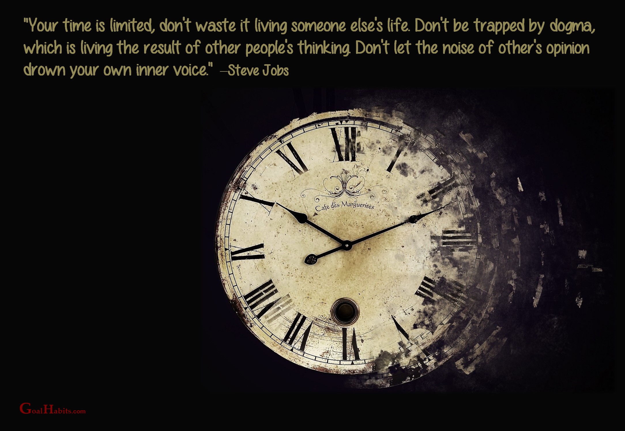 “Your time is limited, don’t waste it living someone else’s life. Don’t be trapped by dogma, which is living the result of other people’s thinking. Don’t let the noise of other’s opinion drown your own inner voice.”