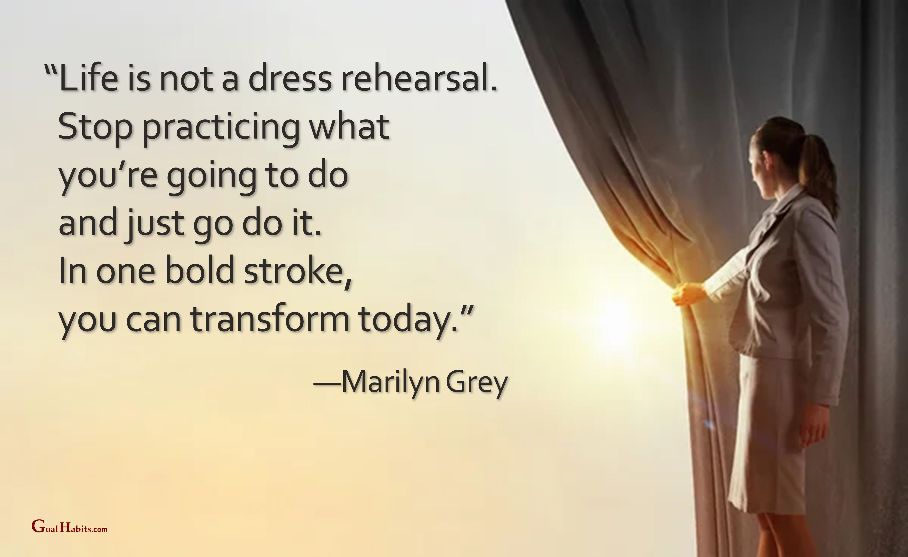 Success Quote on Action Posted on February 3, 2023 by Paul Mark Sutherland Reply “Life is not a dress rehearsal. Stop practicing what you’re going to do and just go do it. In one bold stroke, you can transform today.” —Marilyn Grey ________________________ Enjoy today.Achieve today.Tomorrow is promised to no one! original graphic credit: unknown Share this: Click to share on Facebook (Opens in new window) Facebook Click to share on X (Opens in new window) X Click to share on LinkedIn (Opens in new window) LinkedIn Click to share on Pinterest (Opens in new window) Pinterest Click to share on Reddit (Opens in new window) Reddit Click to email a link to a friend (Opens in new window) Email More Click to print (Opens in new window) Print Like Loading...